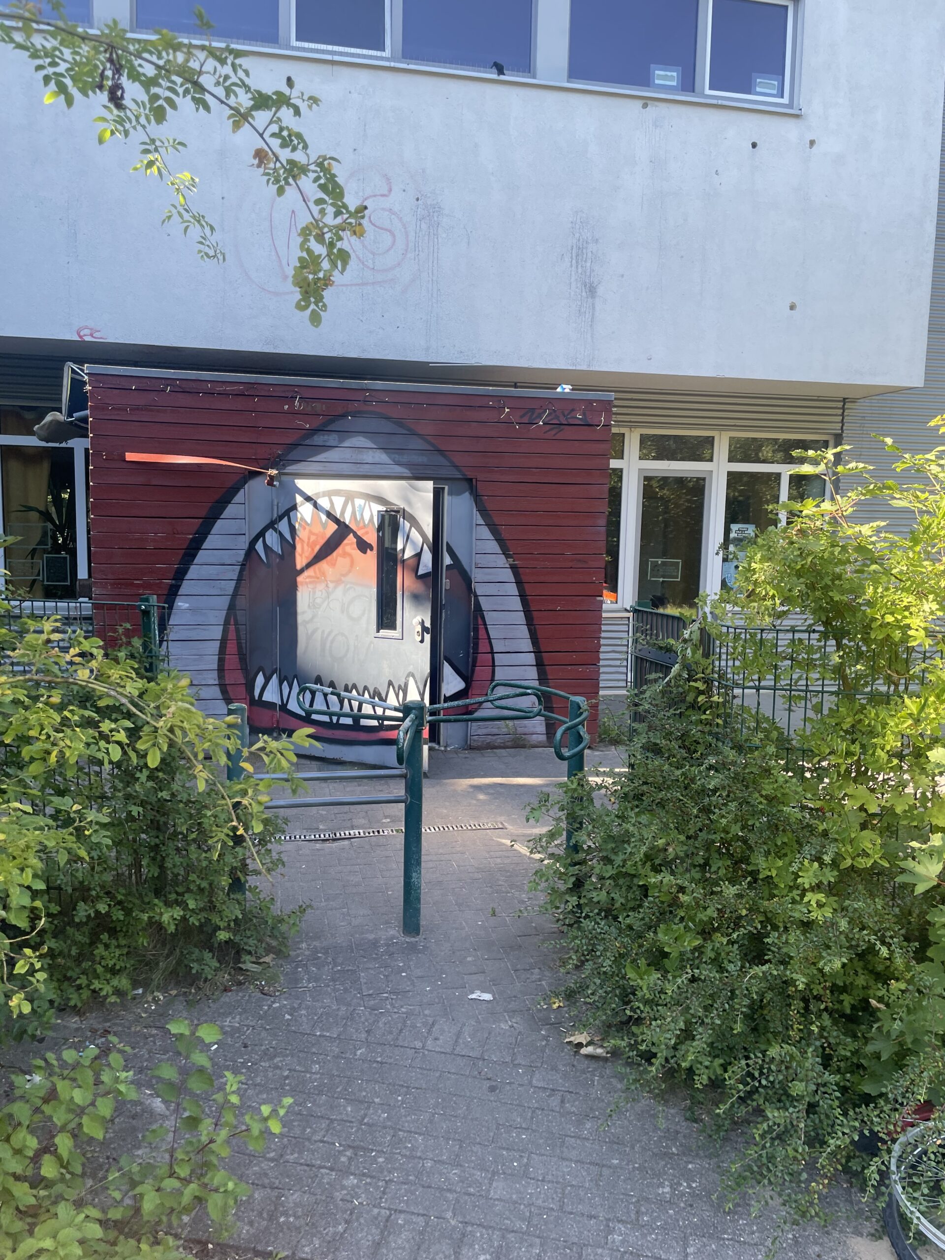 Schon als ich vor der Tür des Jugendclubs stand, hat mich ein Gemälde sehr beeindruckt: Im Eingangsbereich ist ein riesiges Haifischmaul gemalt, das mir persönlich sehr gut gefallen hat. Zugegeben, für den einen oder anderen mag dieser Club etwas versteckt liegen – zumindest empfand ich es so –, aber er ist trotzdem leicht mit der U1 nach Fuhlsbüttel und mit dem Bus 174 nach Lapplandring zu erreichen.